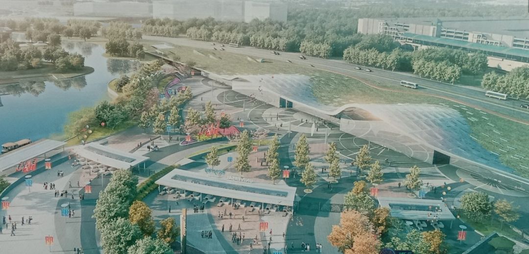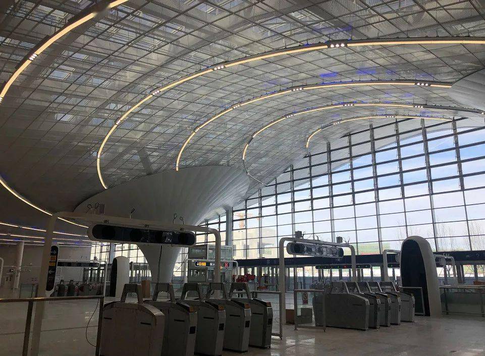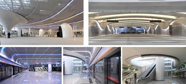 本站是北京首座地景式地铁站,钢结构屋顶分种植区及采光区,种植区约1万平方米,屋顶草坪与环球主题公园内的绿化景观形成一片绿色风景线;站厅与室外的度假区下沉广场处在同一平面,由8根伞状柱支撑,布置48台进站闸机,分层空调、消防及设备管线全部内藏于站厅中央的多个半圆形罗盘箱中;装修设计风格以‘梦幻’为主题,中国的写意山水与西方的科幻未来赋予建筑形体空间中。从南侧看,地铁建筑似乎是从绿地中生长出的一样,5万平米的地铁建筑消隐于主题公园内;而从位于客流进出的北侧看,连续起伏的拱形屋顶宛若一抹写意的水墨山水画,具有明显的标志性,引导乘客抵达。
