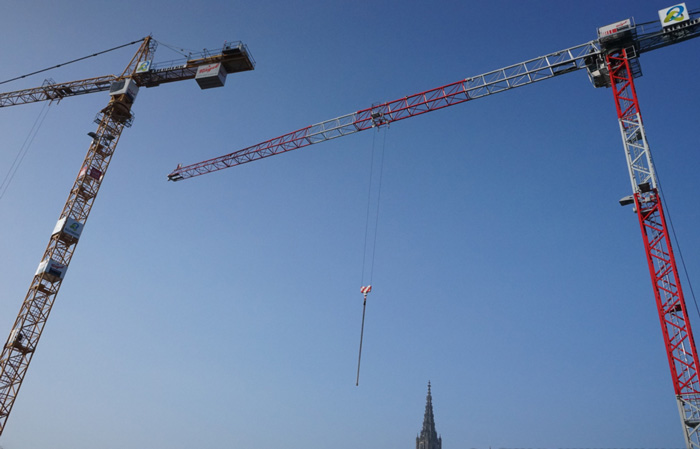 3、塔臂前端设置明显标志,塔吊在运用过程中塔与塔之间回转方向错开。